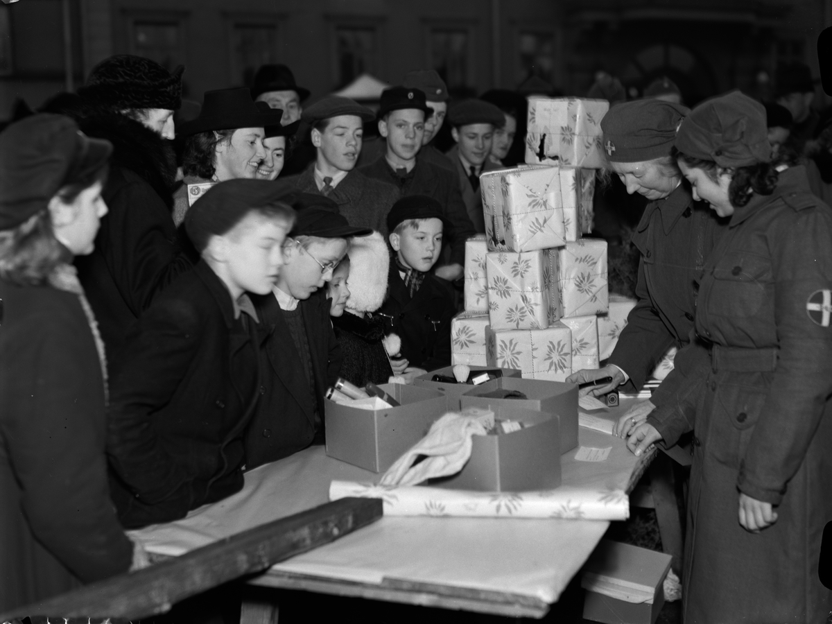 "Lottornas julmarknad gav rekordinkomst. Fullkomlig folkträngsel på Fyristorg" - försäljning av fältjulklappar, Uppsala december 1942