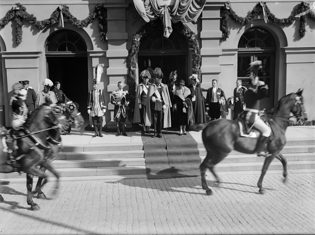 "Jubileumsfästligheterna glansfullt inledda" - kung Gustav V med följe på trappan till Uppsala centralstation, Uppsala september 1927