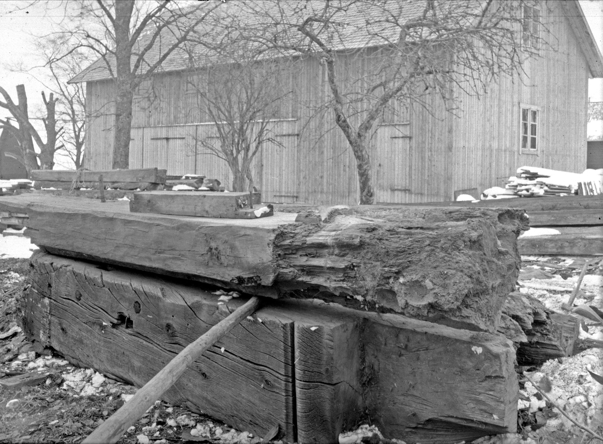 Titel: Portliderstolpar - nu på friluftsmuseet Disagården - under nedmontering i Gränby, Björklinge socken, Uppland