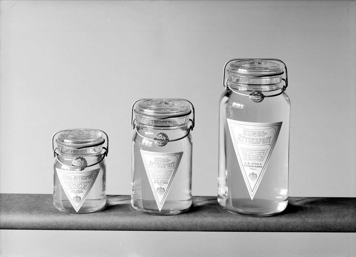 Glasburkar med Kungs-ättiksprit från AB Upsala Ättiksfabrik, S:t Persgatan 39, Uppsala 1937