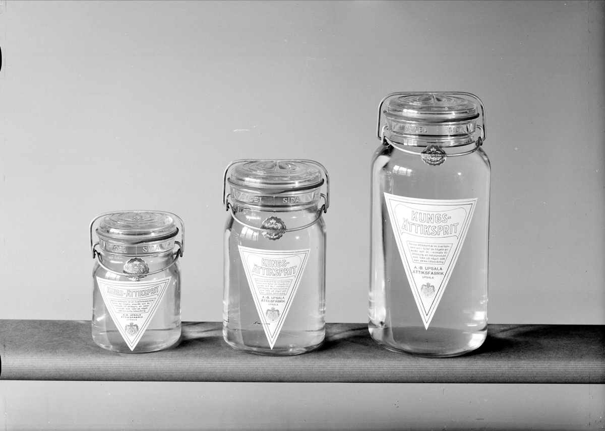 Glasburkar med Kungs-ättiksprit från AB Upsala Ättiksfabrik, S:t Persgatan 39, Uppsala 1937