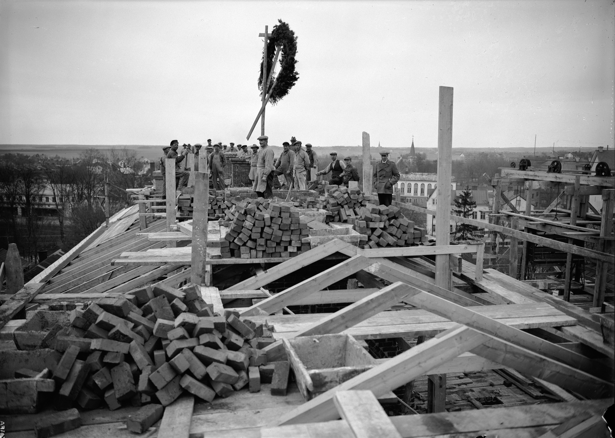 Byggnadsarbetare vid taklagskrans på hustak, Odensgatan, Uppsala juli 1933