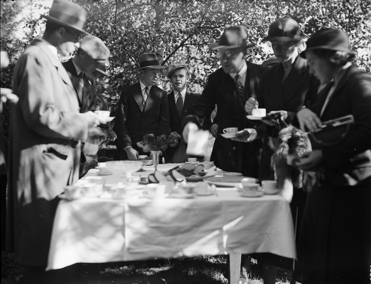 Människor samlade kring kaffebord, sannolikt Uppsala, 1935