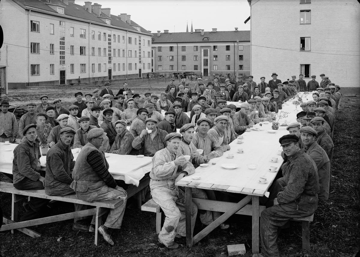Taklagskaffe med byggmästaren Anders Diös, kvarteret Aslög, Kvarngärdet, Uppsala 1936