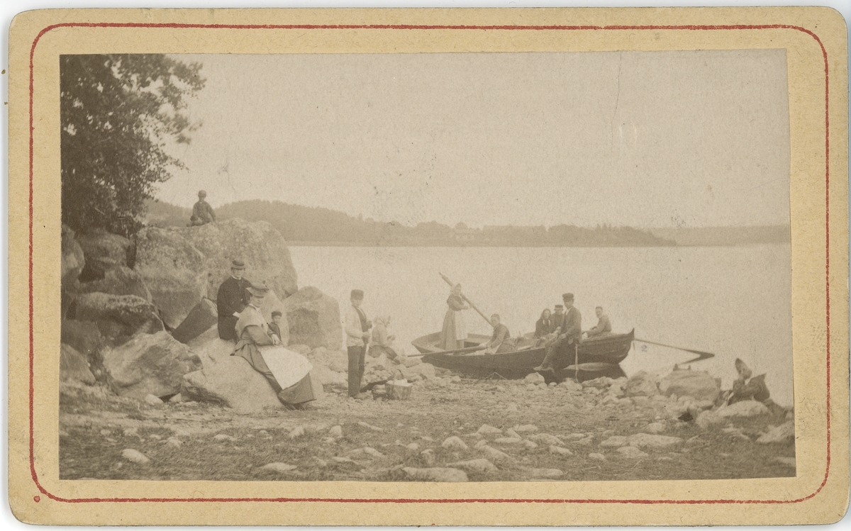 Människor på stranden och i en eka, Krusenberg, Uppland