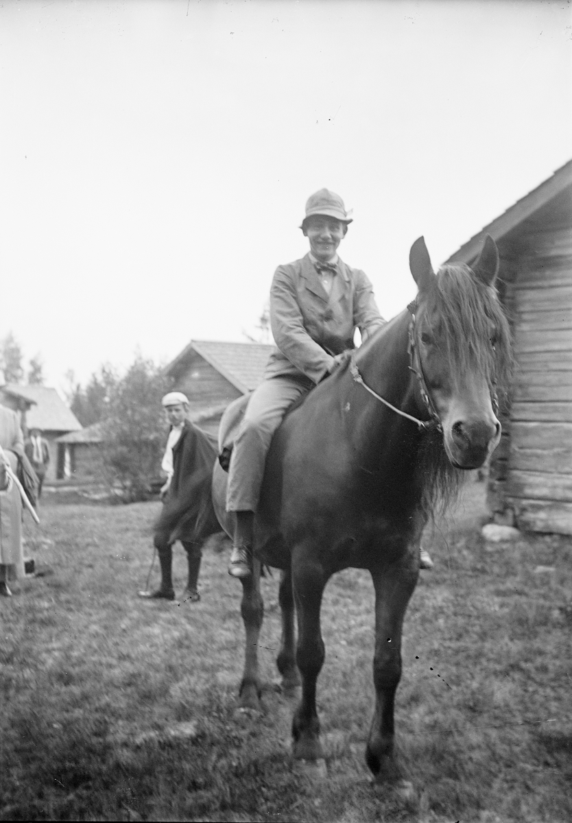 Pojke, sannolikt någon av Ruben och Christiane Liljefors söner, tittar när man sitter på häst på gården, sannolikt i Sverige