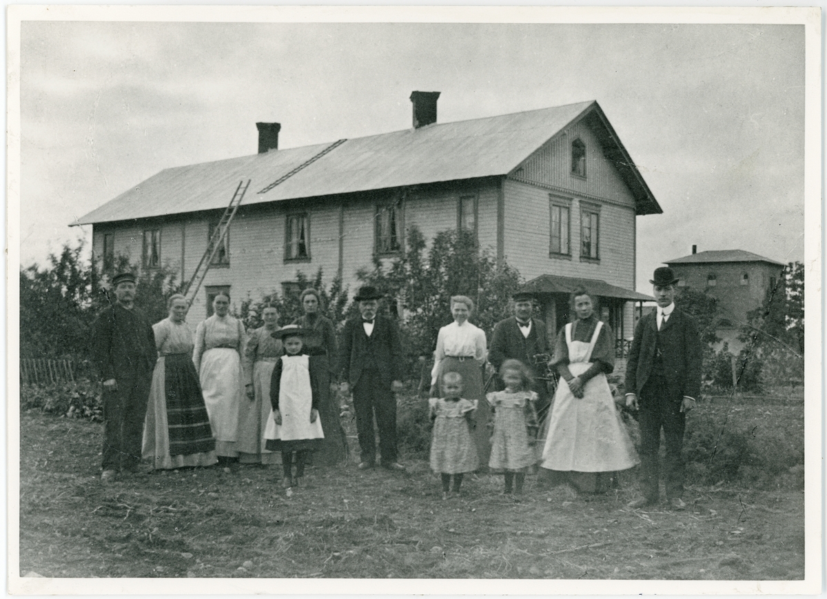 Barn och vuxna samlade framför Frisks gård "Norrbacken", Österbybruk, Uppland 1904