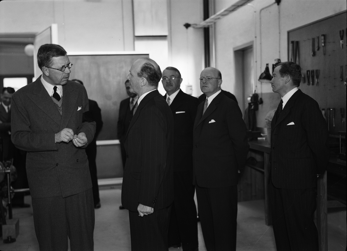 Titel: "Kronprinsen på heldagsbesök vid Lantbrukshögskolan. Tog intresserad del av de senaste vetenskapliga rönen inom modernäringen", Ultuna, Uppsala maj 1947