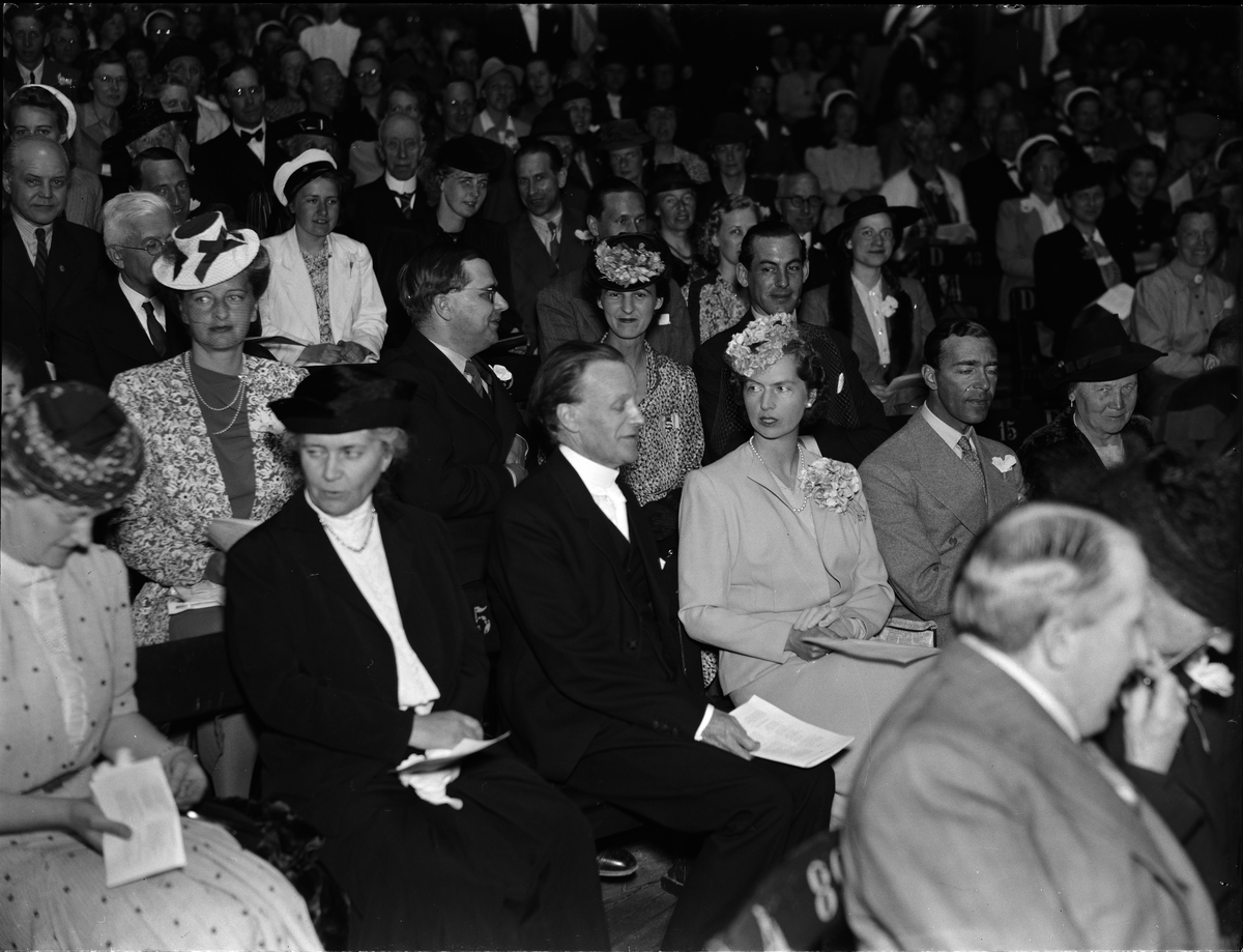 "Vårfesten i Upsala nordiskt betonad" - ärkebiskop Erling Eidem, prinsessan Sibylla och prins Gustaf Adolf i publiken på Allmänna sångens vårkonsert i Universitetsaulan, Uppsala 1942