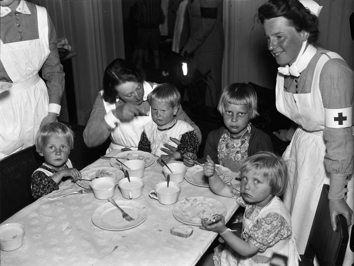 "Stor kontingent finska barn till Upsala i går" - finska flyktingbarn togs omhand på Lottakårens lokal, Uppsala maj 1942