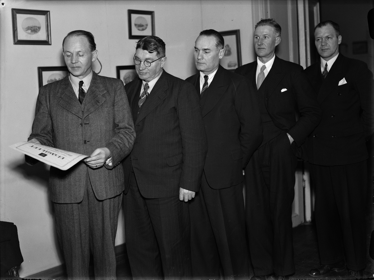 "Upländsk hembygdsrörelse står starkare än någonsin" - Hållnäs hembygdsförening, med köpman Dan Westergren i spetsen, tar emot Disa gilles pris på Östgöta studentnation, Uppsala 1943