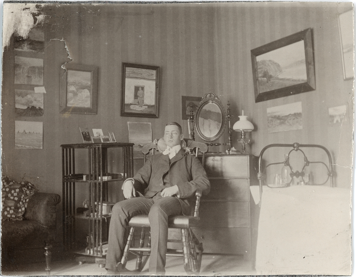 Elias Stenius i gungstol i Norrbyska studenthemmet, Uppsala omkring 1900