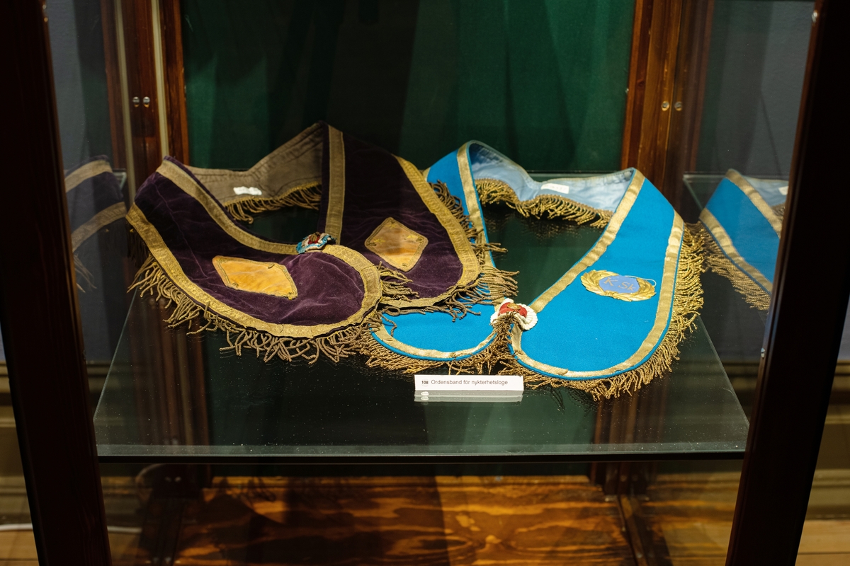 Vänersborgs museum. Tillfälliga utställningen" På kung Oscars tid". Ordensband för nykterhetsloge