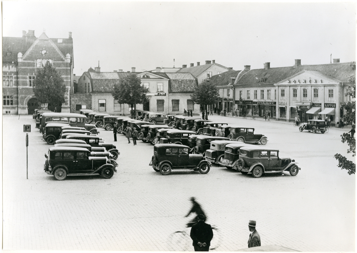 Ett stort antal bilar står parkerade på Stora torget, c:a 1930-tal.