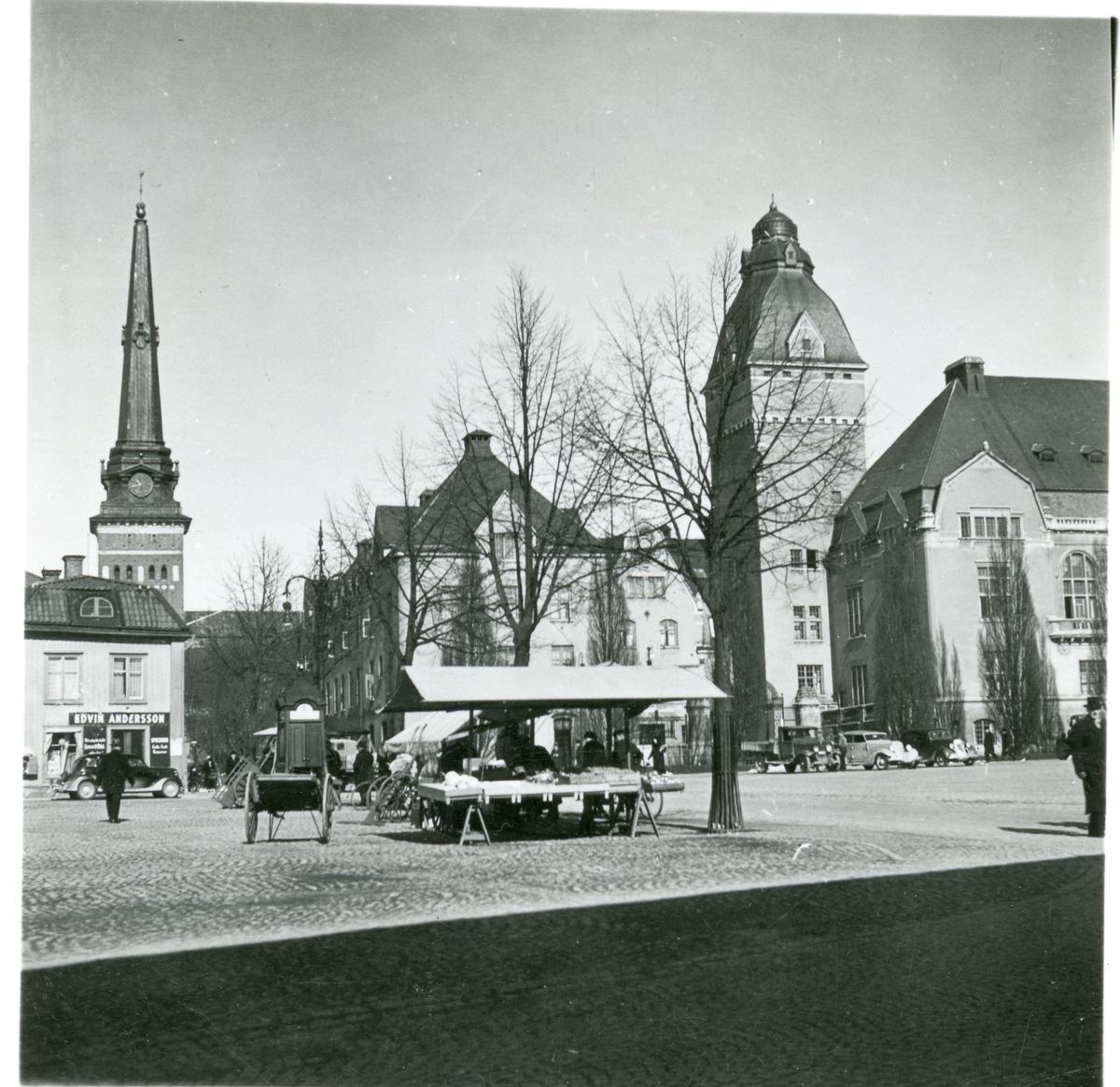 Torghandel på Bondtorget med stadshotellet och Domkyrkan.