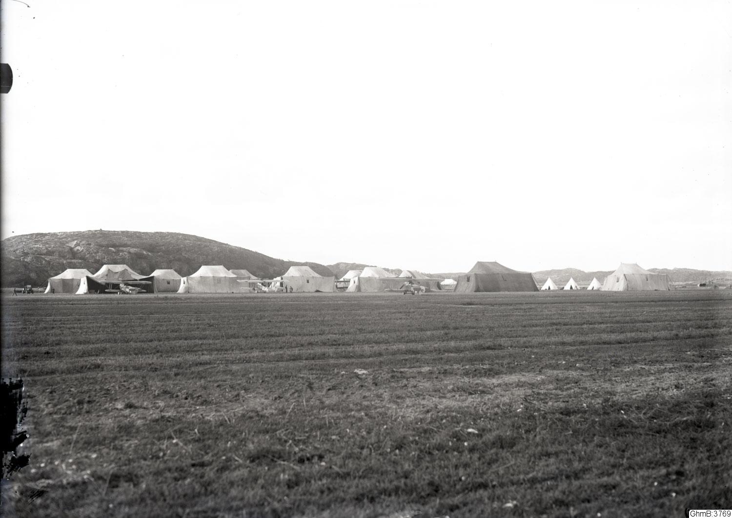 "Svenska maskiner i flyghamnen. Svenska militärflygförläggningen, tälthangarer och förläggningstält"