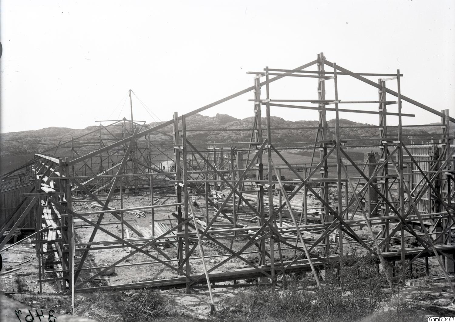 "Göteborgs flyghamn under anläggning. Flyghamnen i Torslanda, hangaren under uppbyggnad, maj"