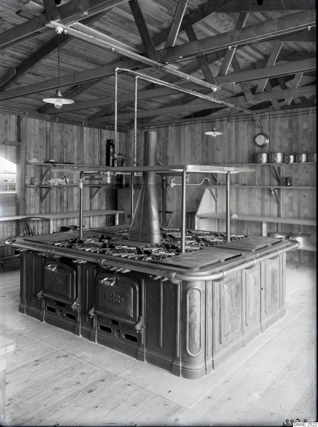 Beskrivning: "Internationella luftfartsutställningen i Göteborg 1923, 20 juli-12 aug. Interiör från svenska militärflygförläggningens kök"