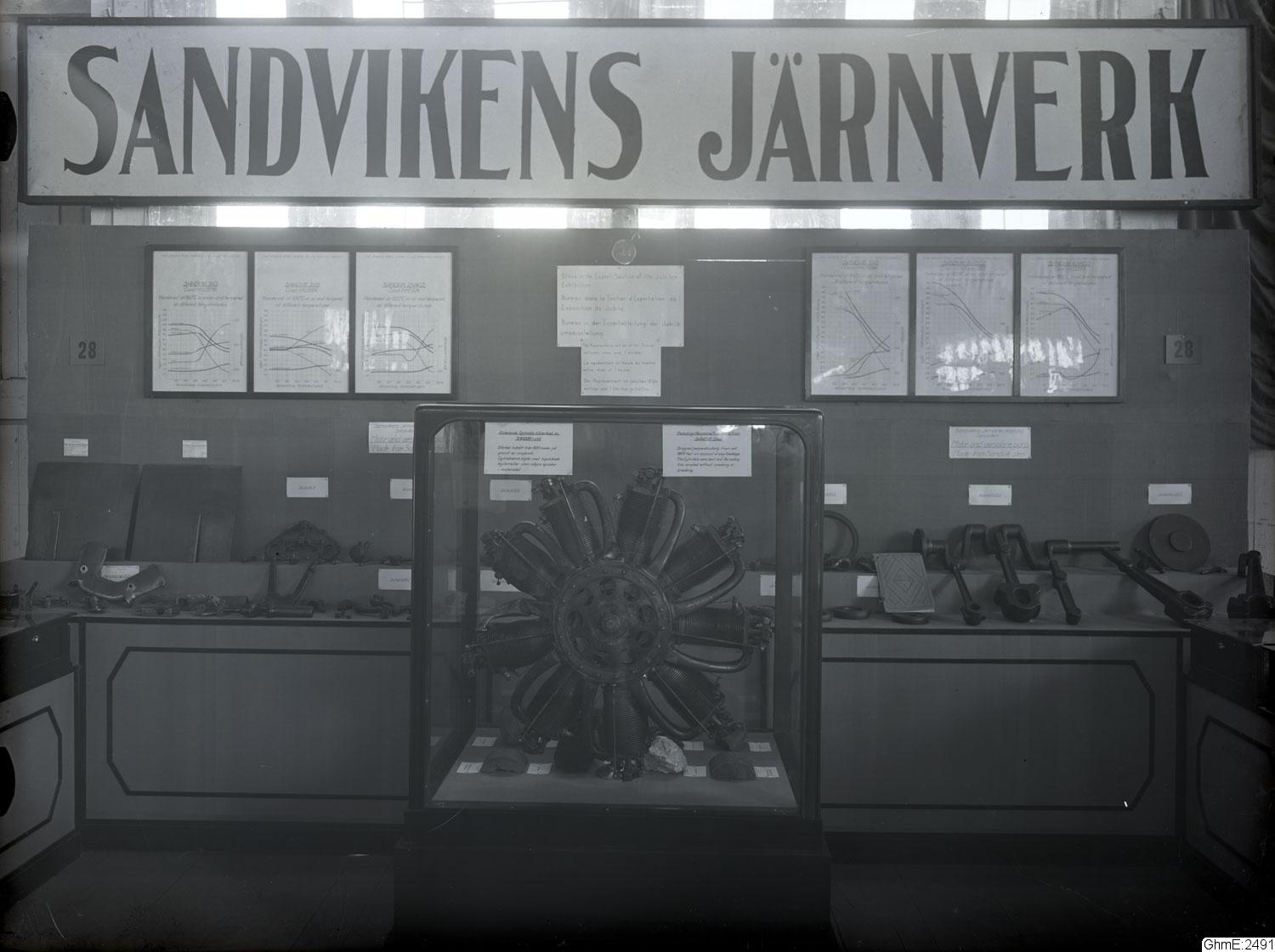 "Internationella luftfartsutställningen i Göteborg 1923, 20 juli-12 aug. Interiörer av stora hallens olika montrar. Sandvikens järnverk"