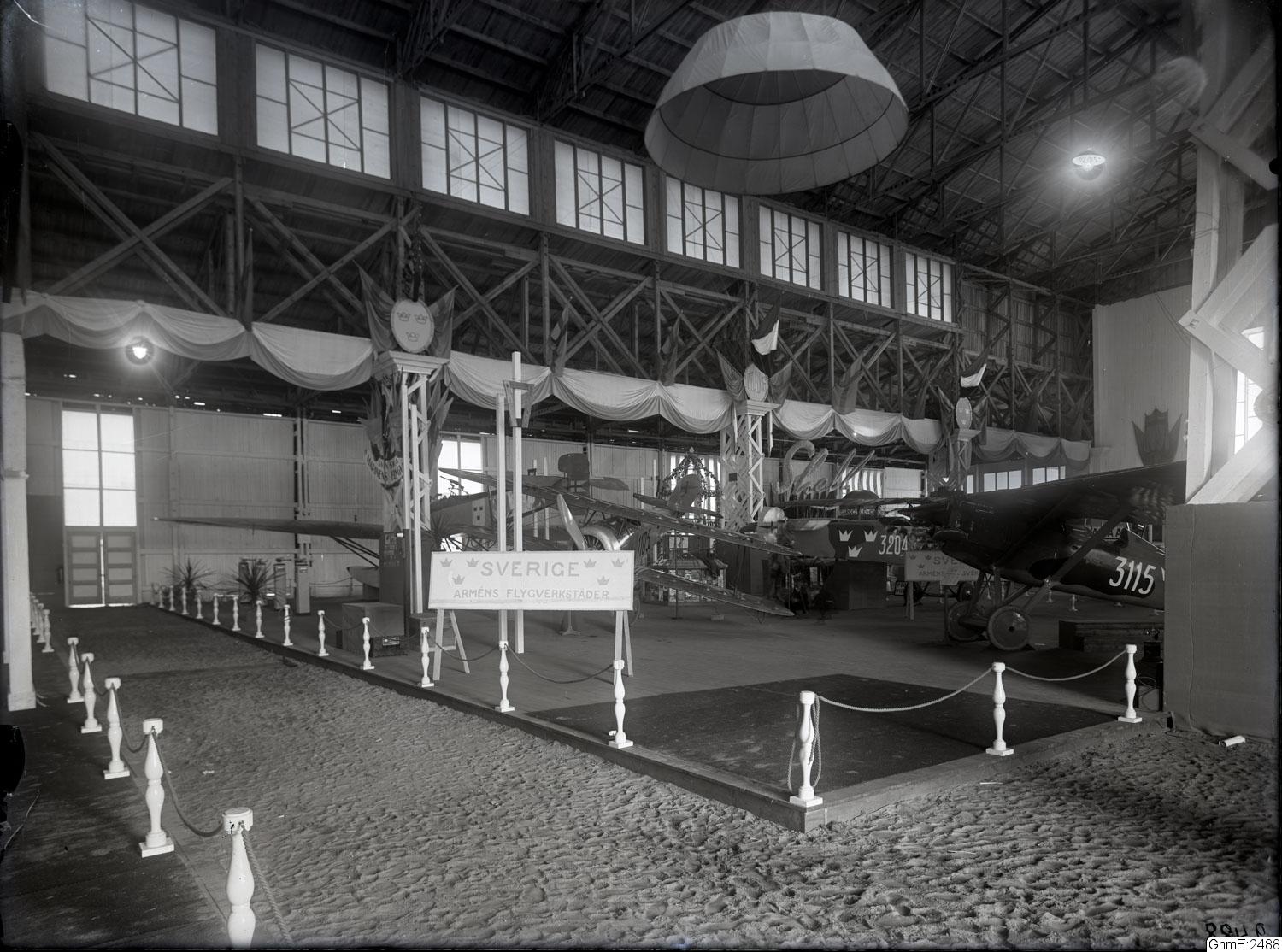 "Internationella luftfartsutställningen i Göteborg 1923, 20 juli-12 aug. Interiörer av stora hallens olika montrar. Arméns flygverkstäder"