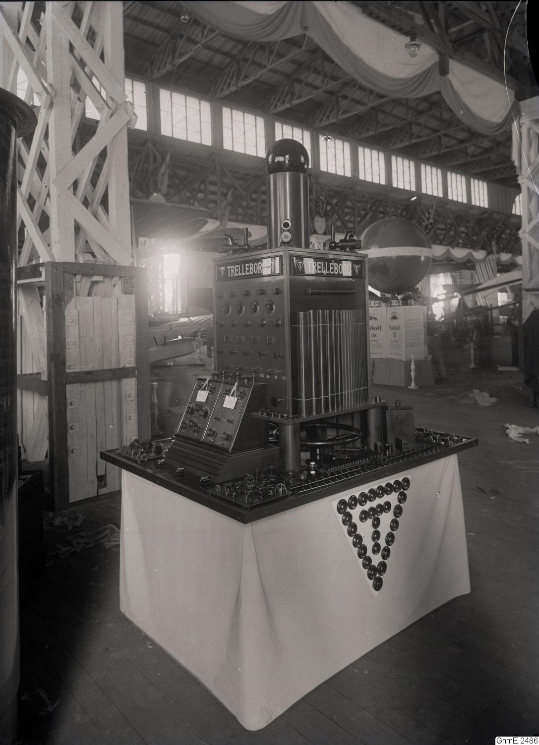 "Internationella luftfartsutställningen i Göteborg 1923, 20 juli-12 aug. Interiörer av stora hallens olika montrar. Trelleborg"