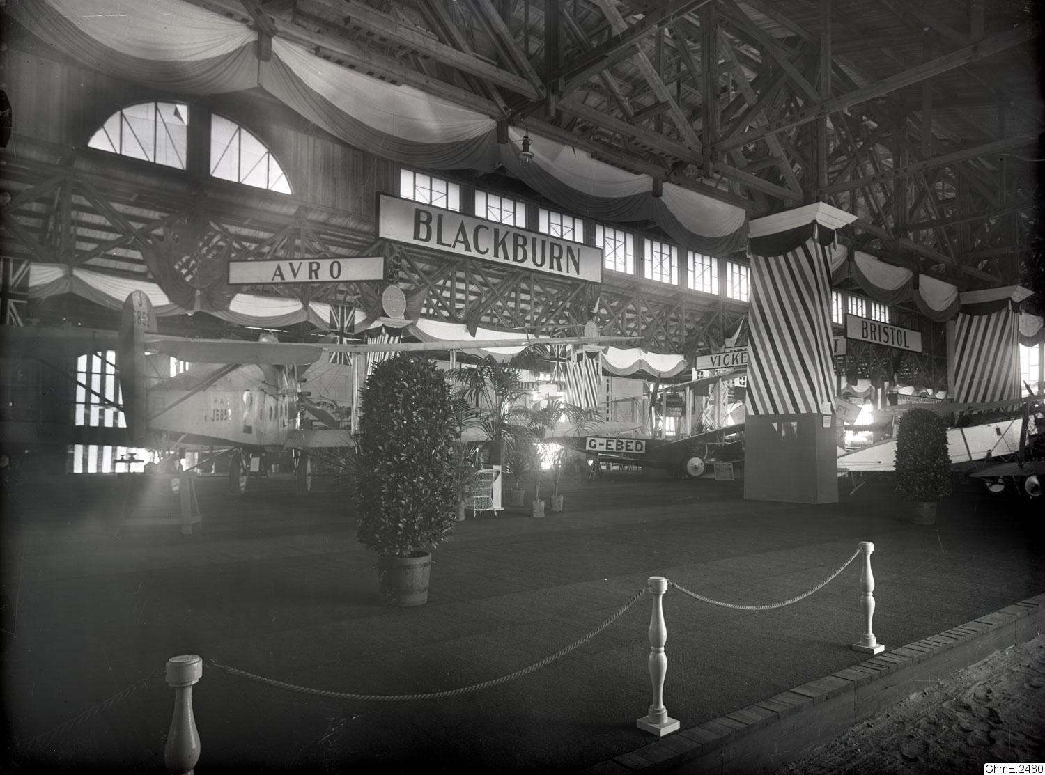 "Internationella luftfartsutställningen i Göteborg 1923, 20 juli-12 aug. Interiörer av stora hallens olika montrar. Blackburn. Avro"