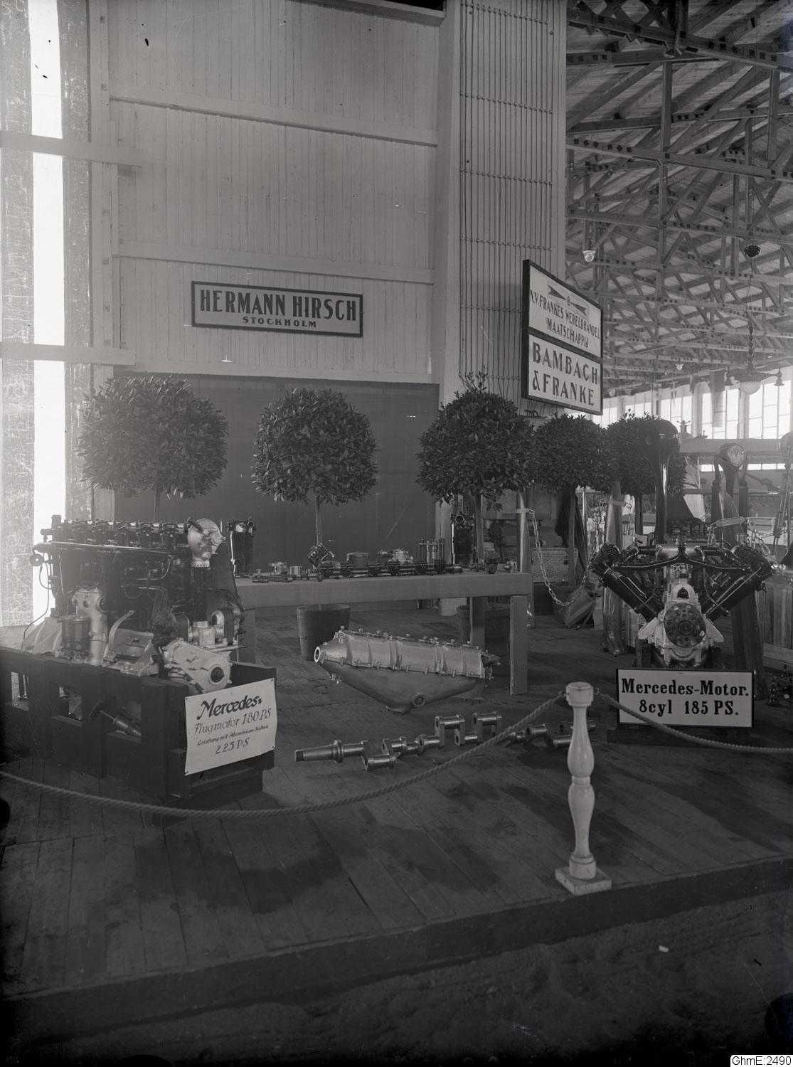 "Internationella luftfartsutställningen i Göteborg 1923, 20 juli-12 aug. Interiörer av stora hallens olika montrar. Hermann Hirsch. Stockholm (Mercedes)"