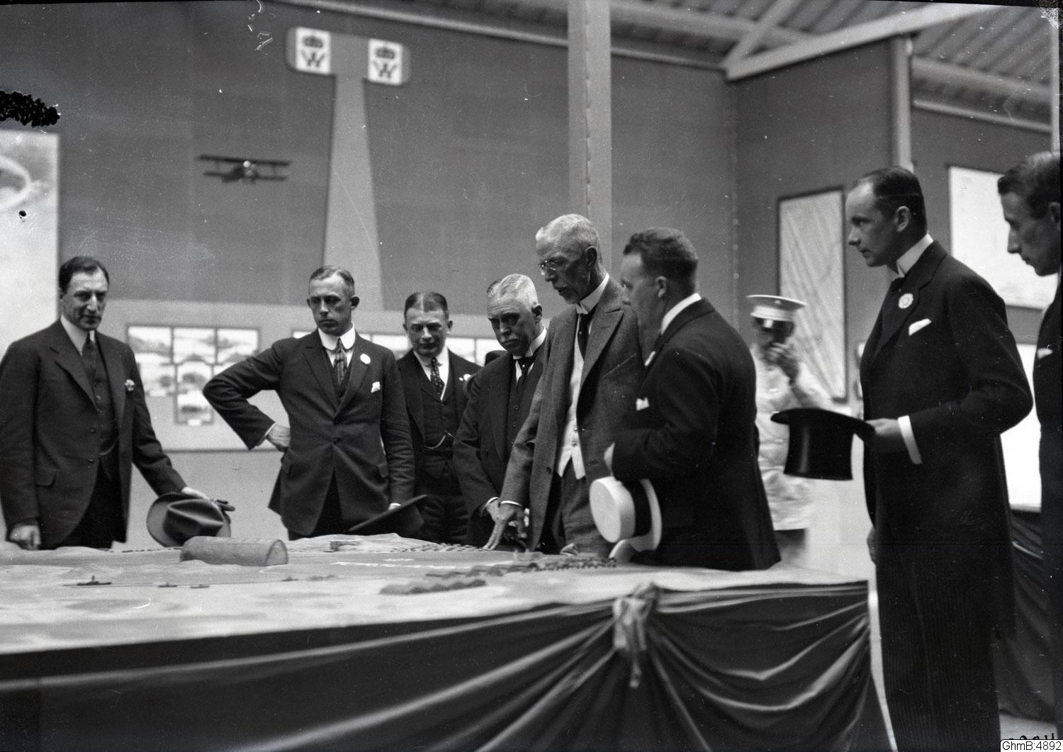 "Internationella luftfartsutställningen i Göteborg 1923, 20 juli-12 aug. Hans Maj:t Konungen besöker Ilug, post- och trafikavdelningen (major Villiards, Åsbrink, Lithander, Hay, Konungen, Cramér, Gerle, K. Lignell)"