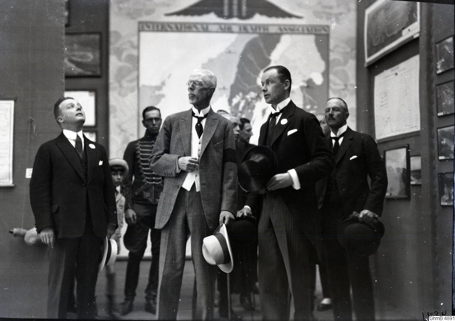 "Internationella luftfartsutställningen i Göteborg 1923, 20 juli-12 aug. Hans Maj:t Konungen besöker Ilug, post- och trafikavdelningen (Cramér, Philipson, Konungen, kabinettskammarherre Hay, major Villiards, Gerle, kabinettskammarherre Aminoff)"