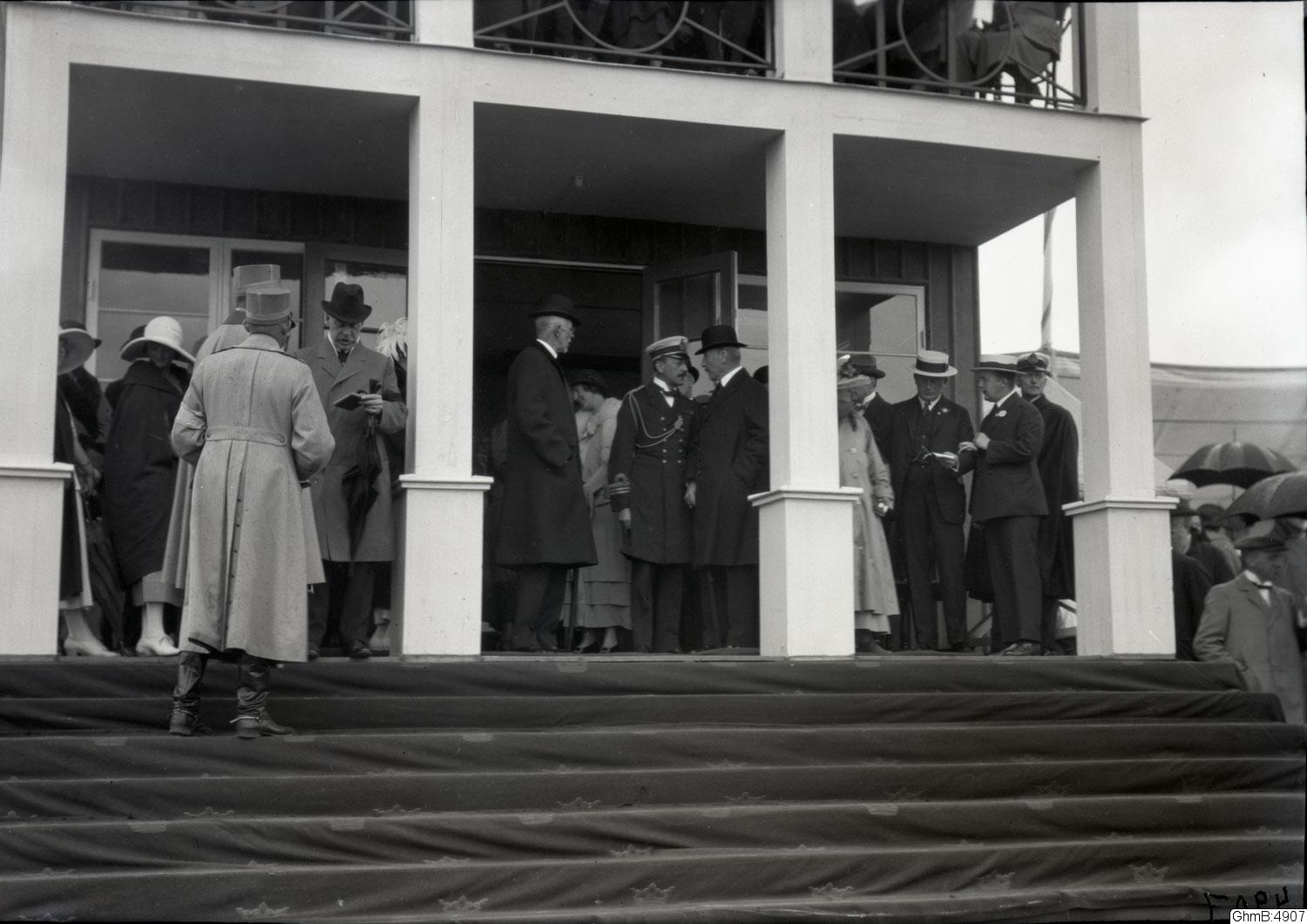 "Internationella flygtävlingarna i Göteborg 4-1 aug. 1923. H. M:t Konungens besök (kapten Åsbrink, överstlöjtn. Amundsson, general Wrangel, Konungen, kommendörkapt. Lindsström, kabinettskammmarherre Aminoff, fru Carlander, direktör Lithander, kamrer Cramér, kapten Werner"