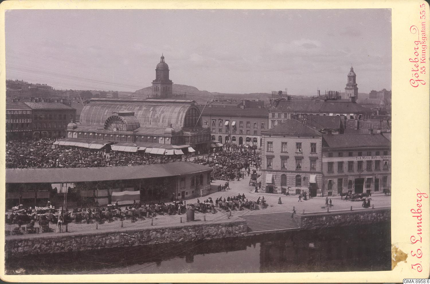 Kungstorget med Saluhallen och Bazarlängan en marknadsdag, ca 1900. I bakgrunden syns tornen till Domkyrkan och Tyska kyrkan.