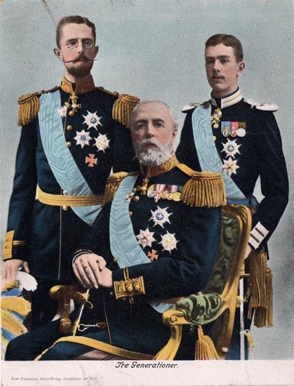 Text på bildens framsida: "Tre Generationer. Handkolorerat porträttfotografi föreställande Oscar II, Kronprins Gustaf och prins Gustaf Adolf.