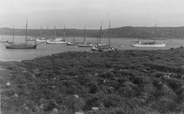 Labyrinten på Skallanäs och fiskeflotta i Skalla hamn, Vässingsö i Onsala.