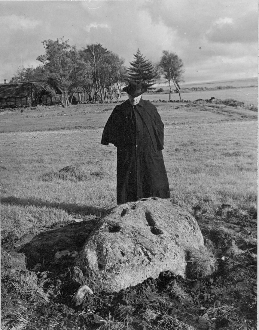 Sten med hällristning och skålgropar i Tjuvahålan Hasslöv. Vid stenen står en man klädd i mörk slängkappa och hatt. I bakgrunden ligger en korsvirkesgård i en dunge varifrån stengärdsgårdar löper ut över ägorna.