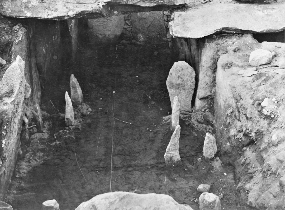 Gånggrift i Tolarp, Snöstorp. "Nischanordningar i gånggriften". Utgrävning av gånggriften vid Tolarp, Snöstorp. Bilden tagen 1926 då arkeologen Folke Hansen från Lund och kyrkoherden /arkeologen Viktor Ewald i Östra Karup undersökte och restaurerade stenkammargraven från yngre stenåldern.