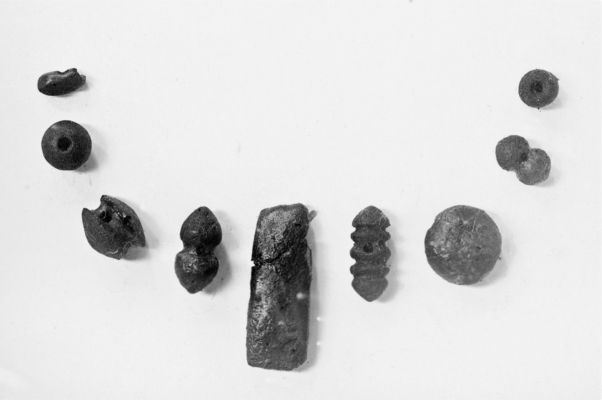 "Ett halsband af fyratusenåriga bärnstenspärlor", enligt anteckningen på fotografiet taget i samband med utgrävningen 1926 av Tolarps gånggrift i Snöstorp. Troligen är fotot taget av någon tidningsfotograf då spaltbredden anges på fotografiets baksida. (Se även F8955, F8956, F8961)