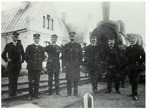 Stinsar och järnvägspersonal på Lis station 1910 framför ett ånglok. Stationen uppfördes vid Mellersta Hallands järnväg 1886.