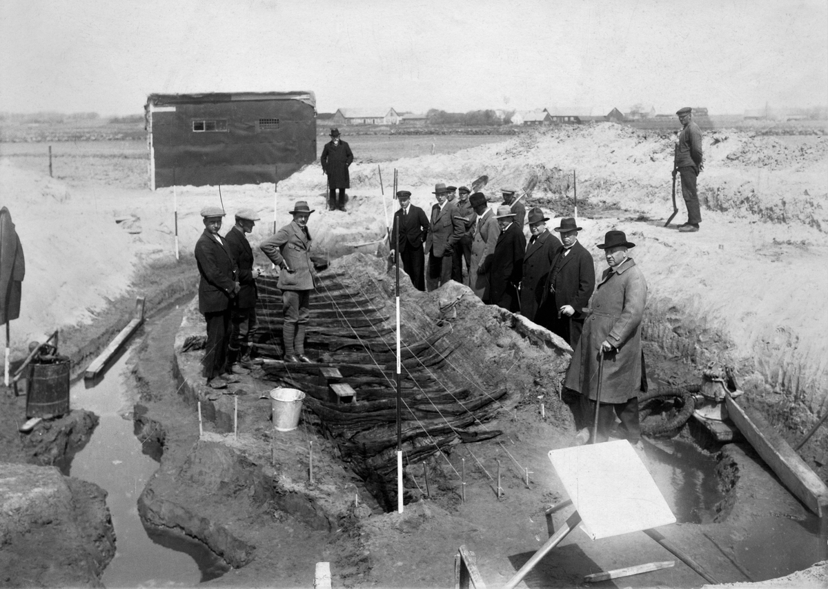 På bilden står direktör Alfred Wallberg i bildens mitt vid skjulet; nr 2 från vänster är ingenjör Gillis Olsson som sedan konserverade båten; nr 3 är byggmästare Adolf Tell; fr v vid skeppets högra sida står ingenjör ivan Pettersson, antikvarie G Hallström, intendent Albert Sandklef vid Varbergs museum, indentent Erik Sallvén vid Halmstads museum, okänd, kassör A. Lagergren samt längst till höger kyrkoherden och arkeologen Victor Ewald.