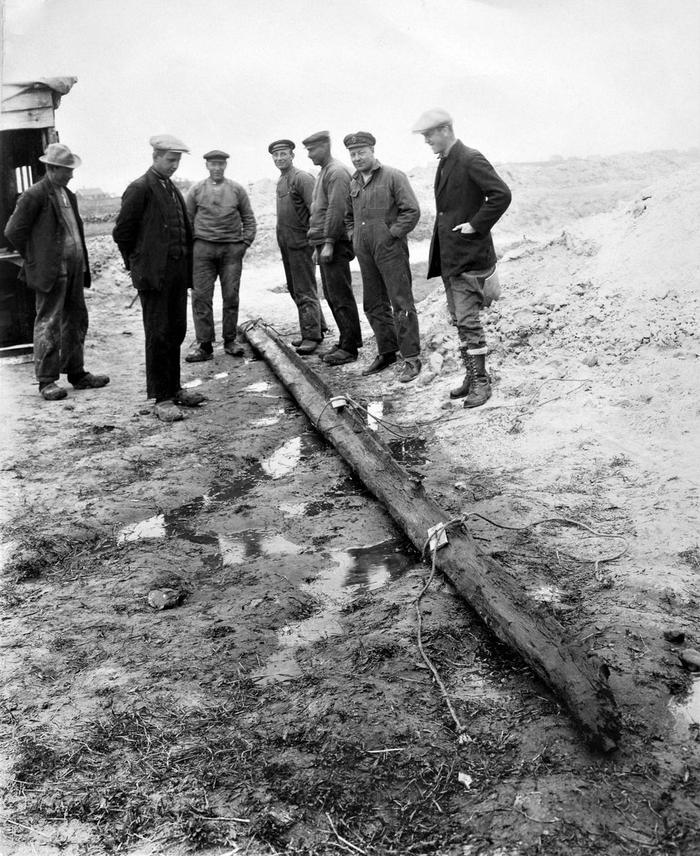 Galtabäcksskeppets köl upptagen vid utgrävningen 1928 i Tvååker. Längst till höger står ingenjör Gillis Olsson, som senare konserverade skeppet, daterat till ca år 1195. Det hade varit ett fraktskepp, en knarr.