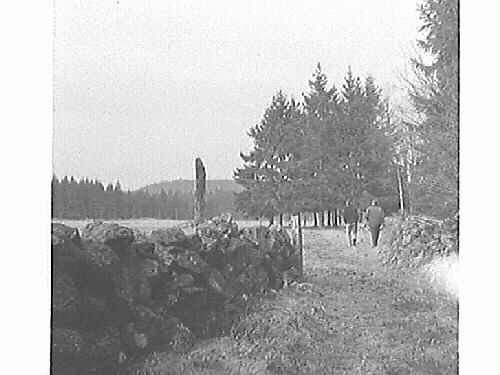 Bautastengravfält från järnåldern vid Köleryd i Skällinge. Ett par män går längs en stig kantad av stenmurar och i höjd med männen står en mycket hög och smal rest sten. Fotografen var chef för Varbergs museum.