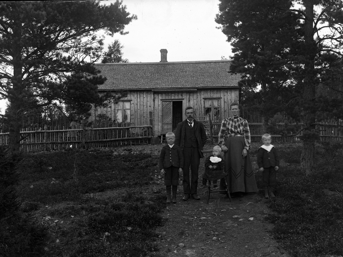 En familj fotograferad framför huset i Nyslätt "Skomakarns". Bilden är tagen på våren/sommaren 1911. Skomakare Johan Andreasson och makan Selma med tre barn: Karl (till vänster i bild) Gunnar och Klas som sitter på en barnstol. Selma är havande med Anna som föddes den 27 sept 1911.