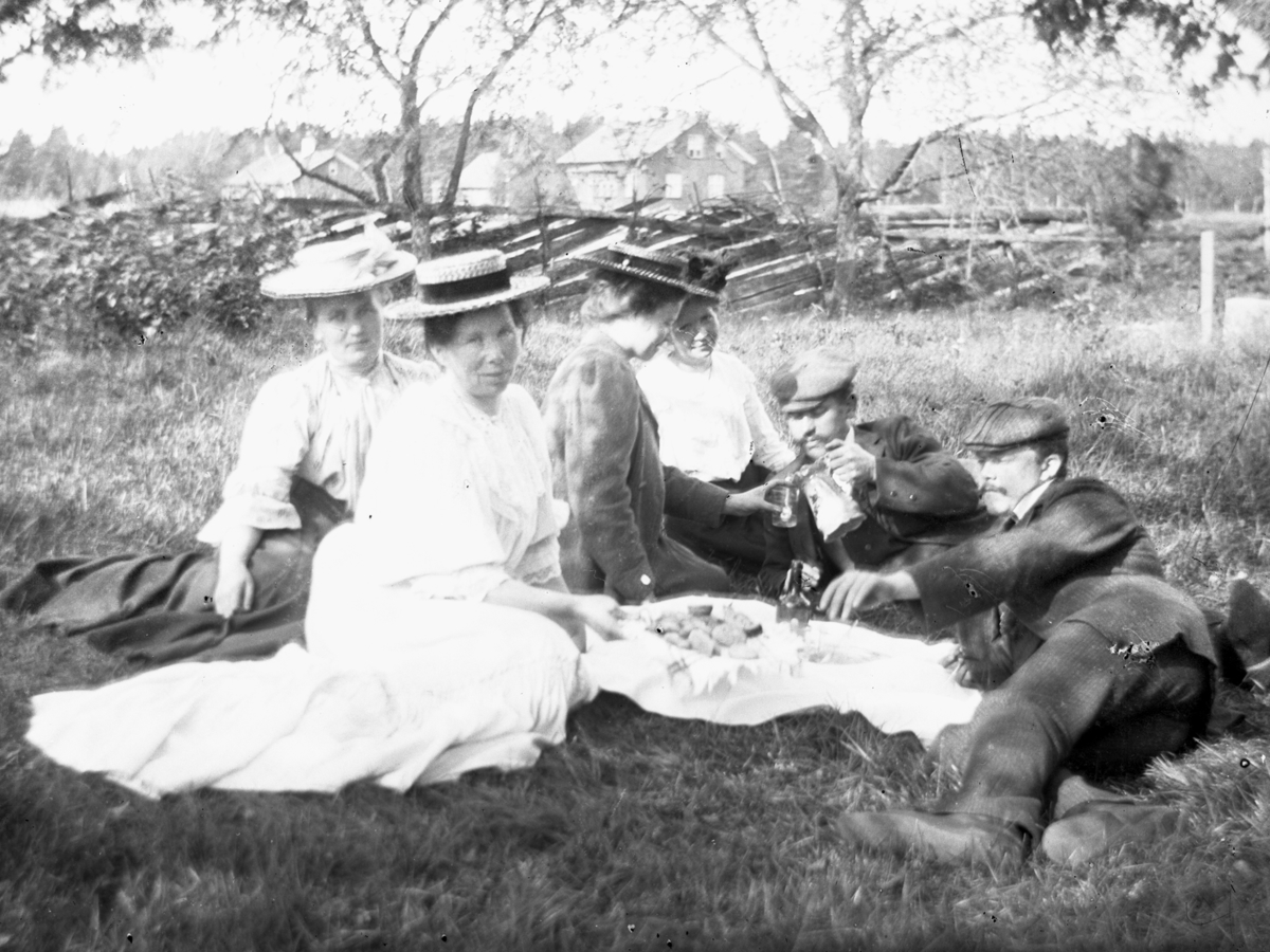Grupp av män och kvinnor dricker kaffe ute sittande på marken. Mannen som ligger till höger i bild är fotografens farbror, August Sikén.