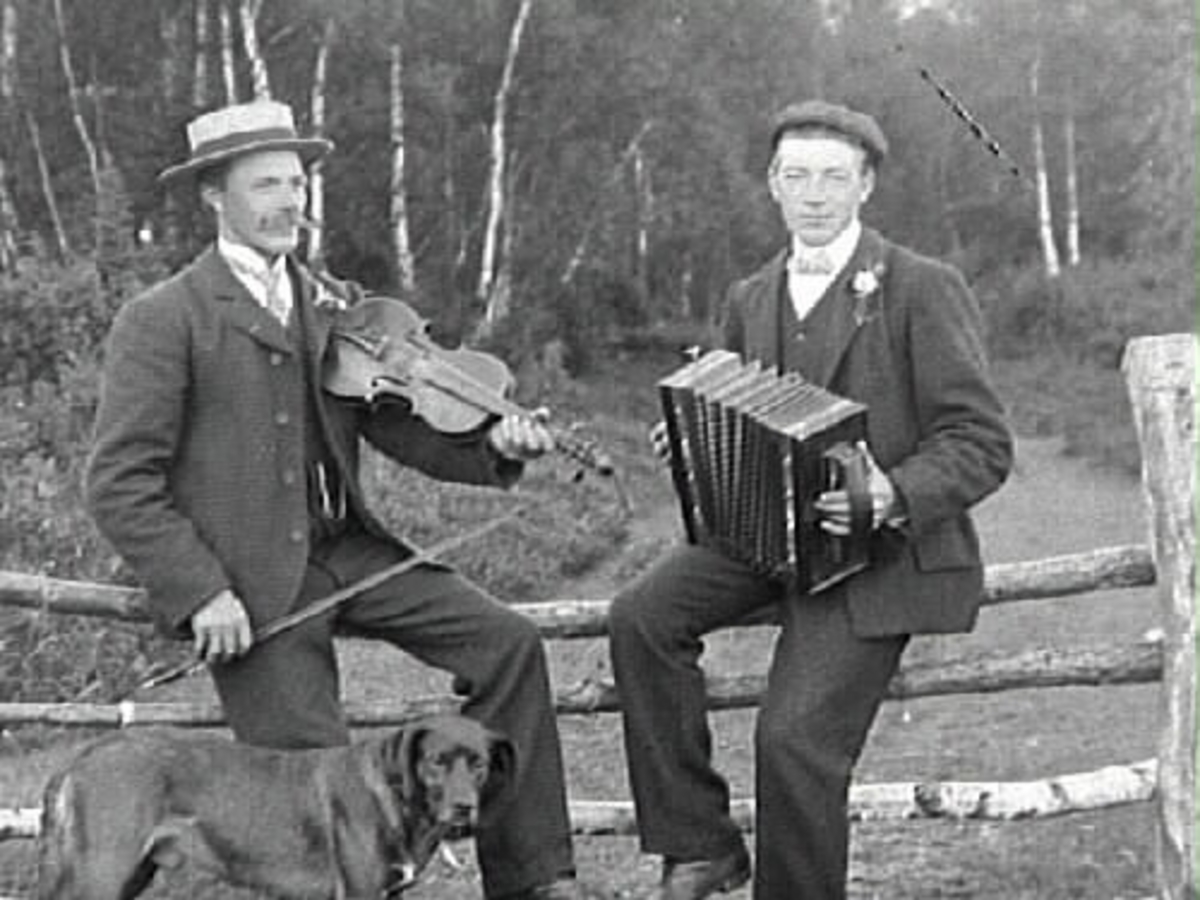 Edard Johansson med fiol, och brodern Klas Johansson med dragspel. Männen sitter på ett stängsel vid en hage med skog i bakgrunden. En hund står bredvid dem.