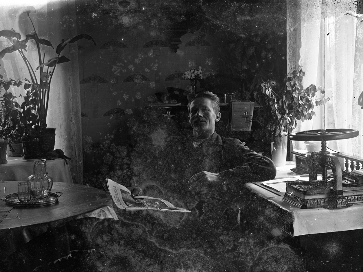 Man fotograferad i ett rum där det finns en press. (Växtpress?)