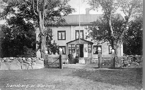 Vykort, "Traneberg pr. Warberg". Mangårdshuset till Tranebergs gård i Varberg. Mannen med hunden bredvid verandatrappan är Ragnar Lundqvist. Byggnaden är knuttimrad i två våningar med falsat plåttak. På grindstolparna sitter stora klot.