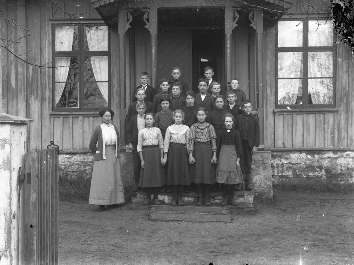 Skolfoto. Skolklass. Eleverna är: Nils Johansson i Bua, Axel Johansson i Björkhaga, Karl Johansson i Gytens, Maria Johansson i Brunared, Selma Larsson i Nygården, Gottfrid Gren i Bua, Axel Sikén i Höjder, Lydia Sikén i Ryd, Judit Andersson i Svebons, Viktor Ljungblad i Skärsjöholm, Johan Karlsson i Rydsbacka, Judit Andersson i Kulla. Lärarinnan heter Anna Modin. Flickan i främsta raden, längst till höger är Tora Fredman i Fredslyckan