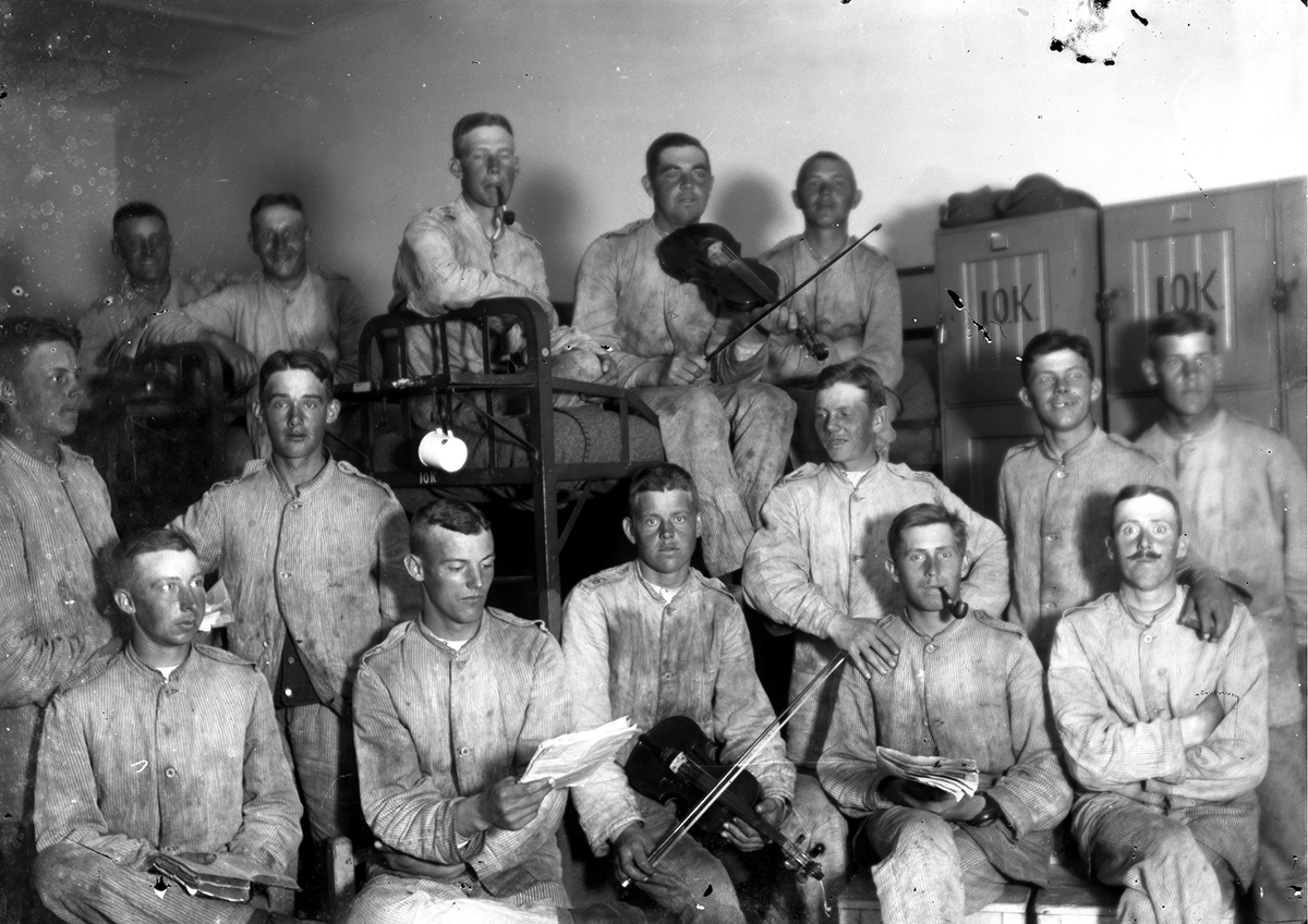 Hallands regemente, I 16. Militärer, inne på förläggningen. Mannen med fiolen i sängen är troligen Gunnar Andersson-Schoultz, f.1909, som tillhörde trossen, 10:e kompaniet. Han arbetade som musiker i dansband bl a.