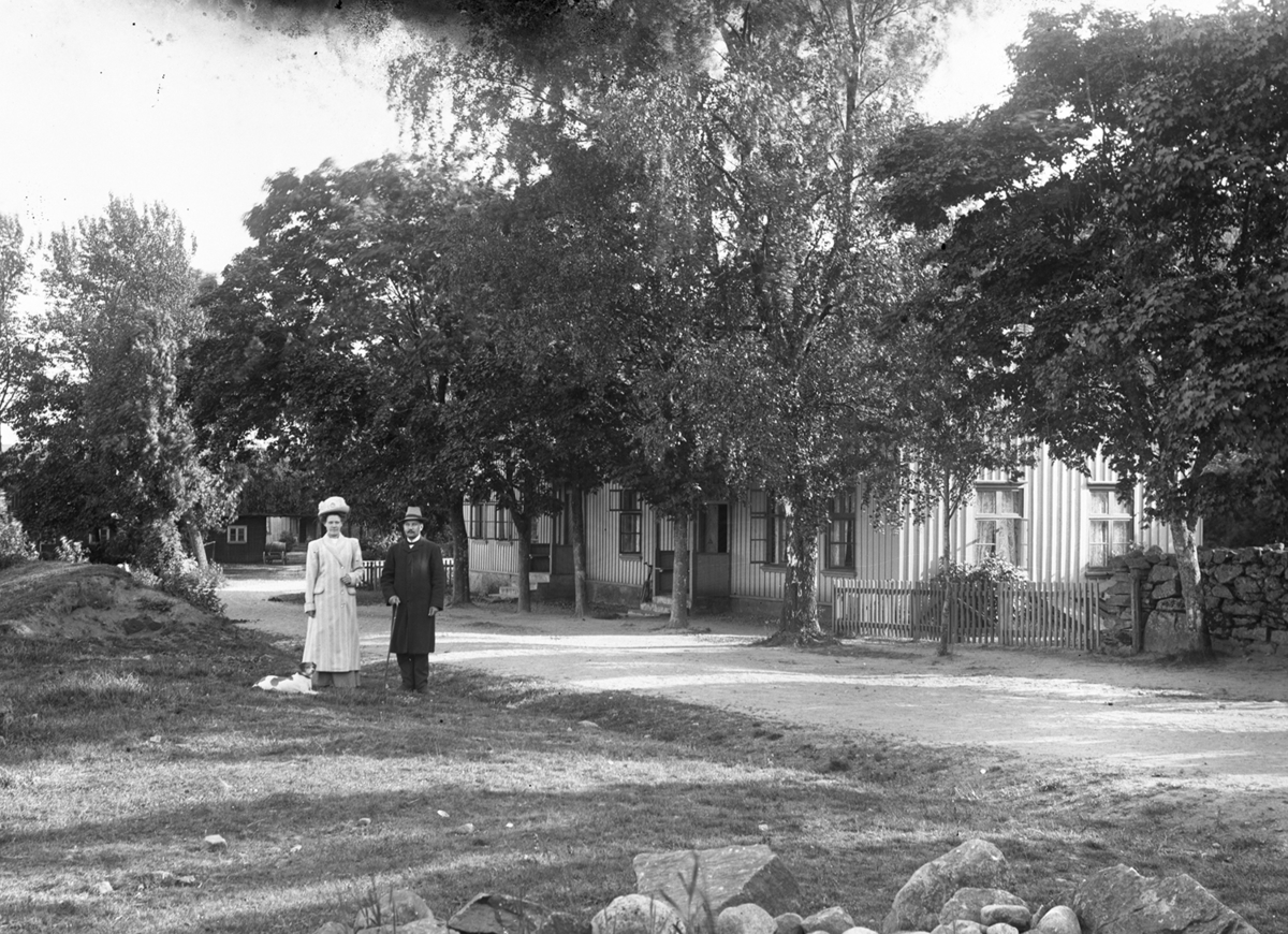 En man, en kvinna och en hund fotograferade utanför en skola?