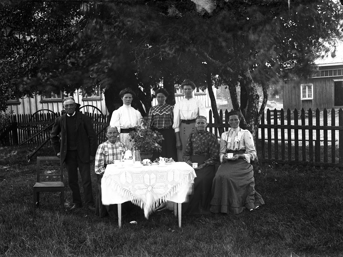 Dukat kaffebord i Storegårdens staketomgärdade trädgård. Under bordet ligger en hund och i bakgrunden syns bostadshus och ladugård. Från vänster: Johannes Andersson, hans fru Inga Kajsa, döttrarna Elemina, Augusta, Hilma, Inga Kajsa Sikén (farmor till fotografen) och ytterligare en dotter till paret Andersson. (De är morföräldrar till fotografen.)