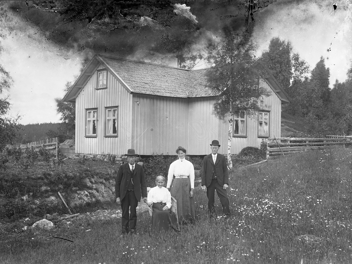 Gruppbild av två män och två kvinnor fotograferade utanför ett bostadshus.